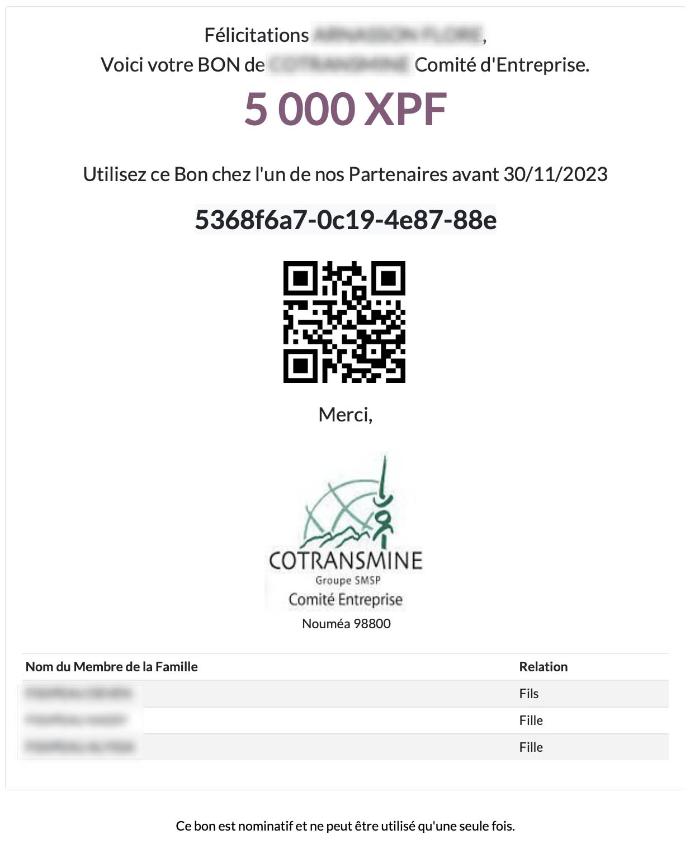 Le commerçant (Partenaire) scan le bon qui est aussitôt validé et déduit sur vos achats. Un fois validé, ce bon ne peut plus être réutilisé. Il nominatif, valable une seule fois et uniquement chez l'un des commerçants partenaires du CE de votre Entreprise.